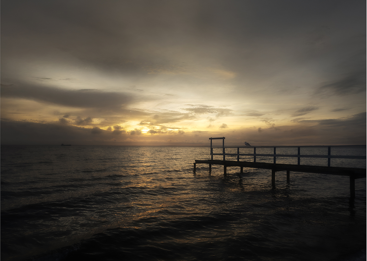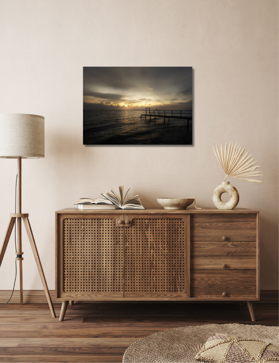 “Solnedgång vid bryggan på Råå”. Canvastavla som levereras med krok. Klar att hängas upp.
